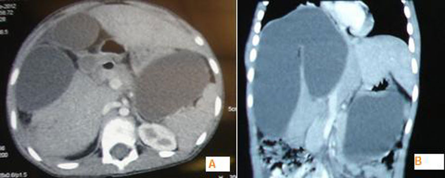no icterus. On examination, there was distension of abdomen limited to the