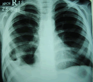 x-ray chest showed bilaterally well expanded lungs except for a cavitatory lesion at the right lower zone. Ultrasound (US) chest