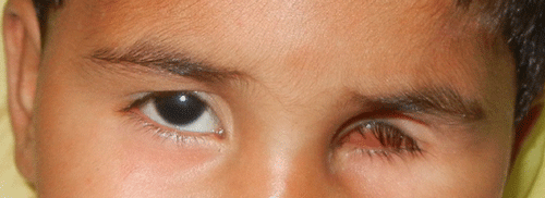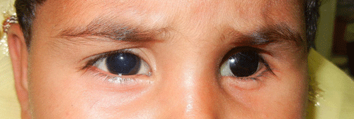 A 3-year-old female child was referred to department of Prosthodontics with the history of enucleated left eye two month back due to retinoblastoma of eye (Fig. 1). Keeping in mind the aesthetics and age of the patient, it was planned to make an ocular prosthesis. First, petroleum jelly was applied to the eye-brows for the easy removal of the impression after setting. For impression a customized perforated tray was used (Fig. 2). A thin mix of ophthalmic alginate (Ophthalmic moldite, Milton Roy Co. Sarasota Fla.) was used. The patient was asked to move her normal eye in all directions to allow the alginate to flow into all areas of the enucleated socket. The technique was modified here onwards by trimming out the iris portion of the stock eye and orienting it on the cast according to previously transferred pupillary mark. Tooth-colored acrylic (SC 10, Pyrax, Roorkee, India) was matched with the color of sclera of the opposite eye. Then the adjusted and modified stock eye-wax pattern combination was processed. Red silk fibres to mimic veins were placed in the dough of the determined acrylic shade followed by routine curing, finishing and polishing. Finally, a thin film of the sclera was removed and replaced by a clear film of transparent heat-cured PMMA (Trevalon, Dentsply India Pvt. Ltd., Gurgaon, India). The properly finished and polished prosthesis was inserted in the socket after being disinfected and lubricated with an ophthalmic lubricant (Ecotears, Intas Pharmaceuticals Ltd, Ahmedabad, India) (Fig 3). Necessary instructions for cleaning, insertion and removal of the prosthesis were given to the parents.