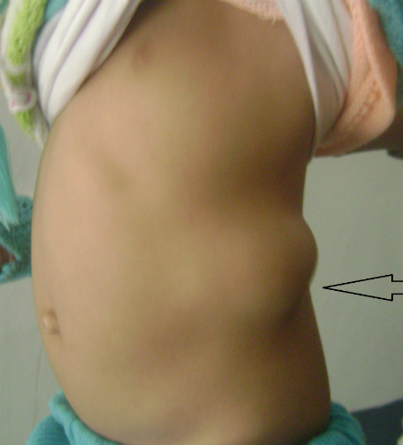 A 2-year-old girl presented with a swelling in left lumbar region noticed by parents one year back. The swelling gradually increased in size. It use to become more prominent on crying. On examination, there was a globular painless swelling (5cm x8cm)which was soft, reducible, and present below the left costal margin lateral to the dorso-lumbar spine (Fig. 1). X-rays of the chest showed D8-L1hemivertebrae, scoliosis with convexity to the right and absent 10th, 11th, and 12th ribs (Fig. 2).Ultrasound abdomen showed a hernial defect in the left lumbar region measuring 4.5cm x 2.9cmwith presence of bowel loops. Operative findings showed hernial sac containing small intestines with absent lower ribs. Hernial sac reduced and mesh was placed in the defect. Postoperative recovery was uneventful. At 1-year follow-up, there was no recurrence.