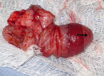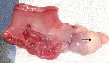 Figure 2: The polypoid growth after being reduced. Ectopic tissue at the tip is well appreciable (arrow). |