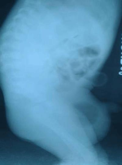 Figure 1:X-ray Abdomen and pelvis showing gas filled bowel loops and a gas shadow in the scrotum. |