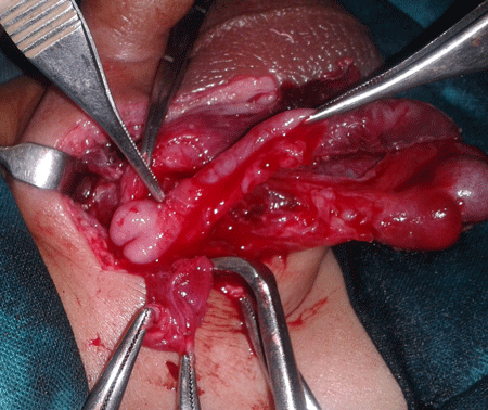 A 4-month-old infant presented with a history of reducible right inguino-scrotal swelling since birth which had become irreducible for 4 days prior to presentation. It was associated with non-bilious vomiting and fever. On examination the child was irritable and local examination revealed an irreducible swelling in right inguino-scrotal region with redness of overlying skin and raised local temperature. Right testis was not separately appreciable due to overlying edema. Abdomen and pelvis lateral view roentgenogram showed gas filled bowel loops in the abdomen and a gas shadow in the scrotum (Fig.1). A diagnosis of strangulated inguinal hernia was initially made. After optimization of his general condition, inguino-scrotal exploration was done. About 10 cc foul smelling yellow pus was drained. The appendix was found in the hernial sac, perforated at the level of proximal third of shaft with gangrenous distal portion. The base of appendix and cecum were healthy and right testis was viable (Fig. 2). An appendectomy was performed. The stump and cecum were reduced and herniotomy done. Wound was washed thoroughly and closed primarily. Postoperative course was smooth, except for wound infection which was managed conservatively. At follow-up the infant is doing fine.