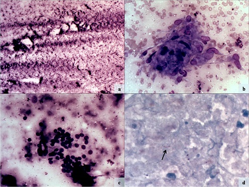On ultrasonography (USG), thyroid gland was diffusely enlarged with altered echotexture. Multiple ill-defined and few well defined nodules were seen in both lobes. Largest nodule in right lobe measured 11mm x 8 mm and that in the left lobe measured 15 mm x 3mm. A radiological impression of multinodular goiter was made. On fine needle aspiration yellowish material was obtained. Giemsa-stained smears showed large areas of caseous necrosis with few epithelioid cell granulomas and foamy histiocytes (Fig. 1a and b). Scattered clusters of benign follicular cells were also seen (Fig. 1c). Ziehl-Neelsen stain revealed occasional acid-fast bacilli (Fig. 1d). A final cytological diagnosis of tuberculous thyroiditis was made.