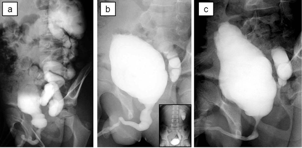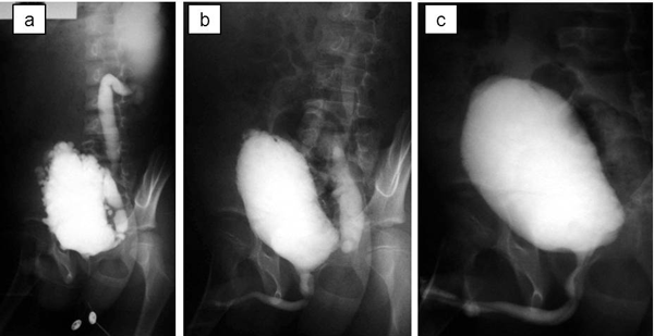 Figure 1: Voiding cystourethrography; (a) before transurethral incision of the valves, (b) before left nephroureterectomy, (c) 7 months after nephroureterectomy |
