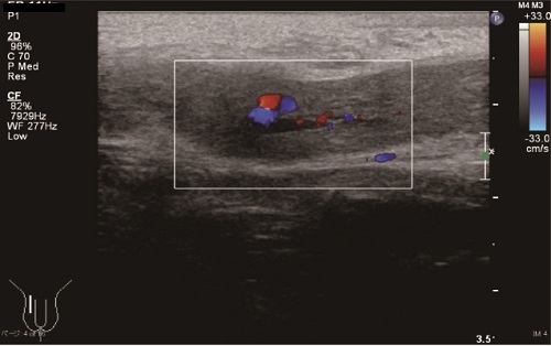 A 7-year-old boy was referred to our center with abnormal penile erection persisting for two days. He complained of mild pain without voiding symptoms. He had no history of trauma. Physical examination showed that the proximal two-third of the penis was tumescent with slight tenderness. Blood tests revealed no evidence of sickle cell anemia or other hematological diseases. Color Doppler ultrasonography (CDUS) showed increased inflow from the cavernous artery toward the corpus cavernosum on the right side. He was diagnosed as a case of non-ischemic priapism of unknown etiology. Spontaneous detumescence was noted after four weeks. At follow-up evaluation 16 months after diagnosis, he had not developed a recurrence. Follow-up CDUS revealed only a small arterio-cavernous fistula at the base of the right corpus cavernosum (Fig.1).