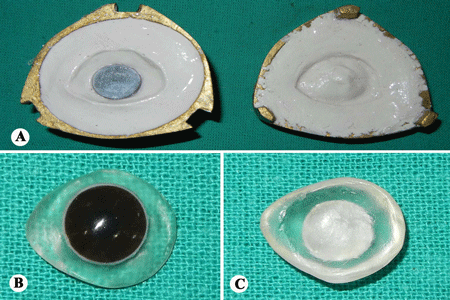 Figure 3: Dewaxed mould (A), transparent scleral shell with iris outer (B), and intaglio surface (C). |